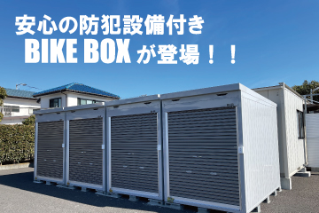バイク専用のトランクルーム。スロープも標準で付いているコンテナで中にはヘルメットや小物が置ける棚も付いています。大切な愛車をいたずらや雨風から守れます。